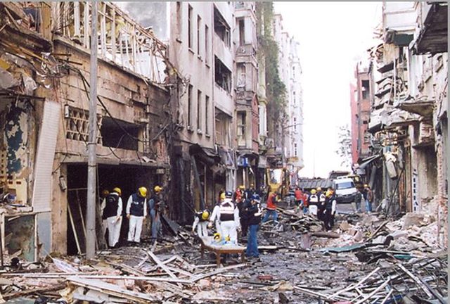 15 Kasım 2003'te Şişli'deki Bet İsrael ve Beyoğlu'ndaki Neve Şalom sinagogları önünde bomba yüklü kamyonetler patlatılır. Beş gün sonra, 20 Kasım 2003'te yine bomba yüklü kamyonetlerle Birleşik Krallık'ın İstanbul Başkonsolosluğuna ve Levent'te bulunan HSBC Genel Müdürlük binasına saldırı düzenlenir. 4 intihar eylemcisi dâhil 59 kişinin hayatını kaybettiği saldırılarda 750'den fazla kişi yaralanır. Neve Şalom' Sinagogu 1986 ve 1992 yıllarında da saldırıların hedefi olmuştur.(Görsel Kaynak: Şalom Gazetesi)